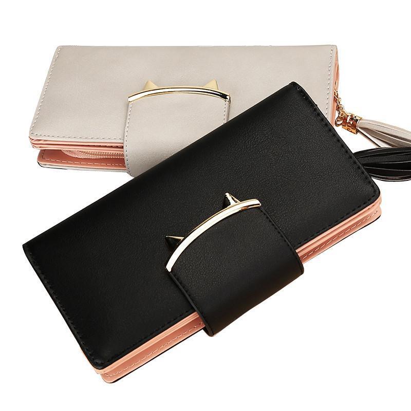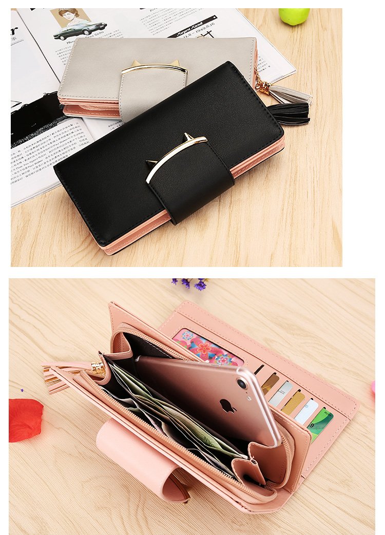 Luxury PurrLux Clutch for Women: Discover our popular, large-capacity purse with a chic, understated cat ear detail. Stay organized with a zip coin section, note sleeve, photo slot, phone pocket, card holders, and ID display. Comes with a stylish tassel. Perfect for any event. Choose from a range of colours. Crafted from high-quality PU leather with polyester lining.